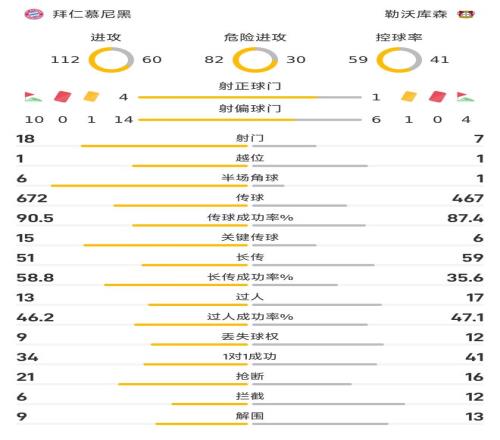 在传球次数上,拜仁以672-467处于领先态势;在传球成功率上,拜仁以90.5%-87.4%占据优势。在关键传球方面,拜仁以15-6则依然处于占优的位置。