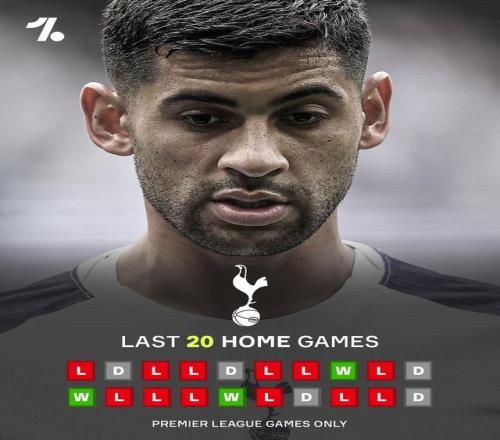 至此,热刺最近20场英超主场比赛只取得3场胜利,其余场次战绩为5平12负。