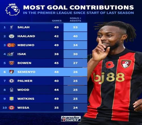 11月18日,德转列出了英超本赛季参与进球占全队总进球比例的球员排名,哈兰德以65%排在了榜首,伯恩茅斯前锋塞门约排在了第二,同时塞门约上赛季至今的英超参与进球数排在了第六。